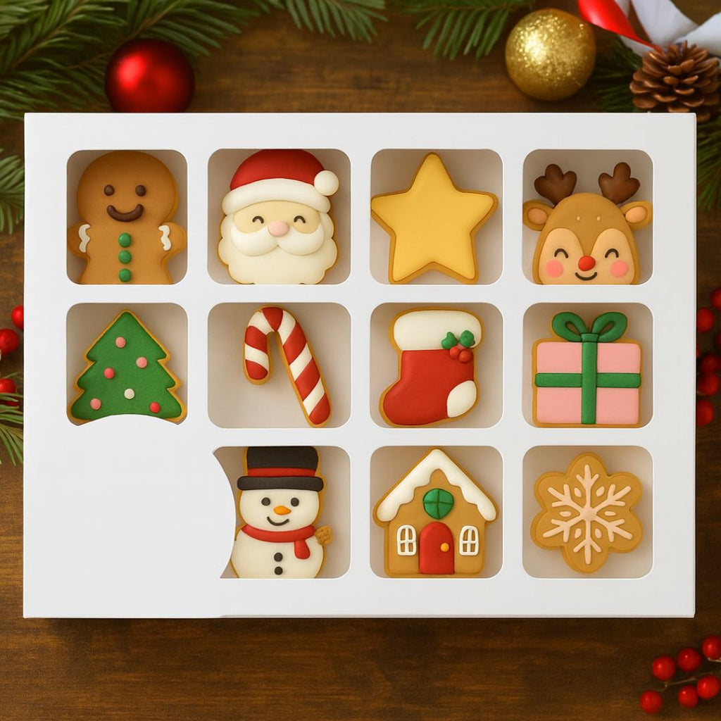 Caja versátil con 12 insertos diseñada para múltiples productos de repostería y pastelería. Perfecta para galletas, donas, macarrones, fresas, postres individuales y otras delicias.