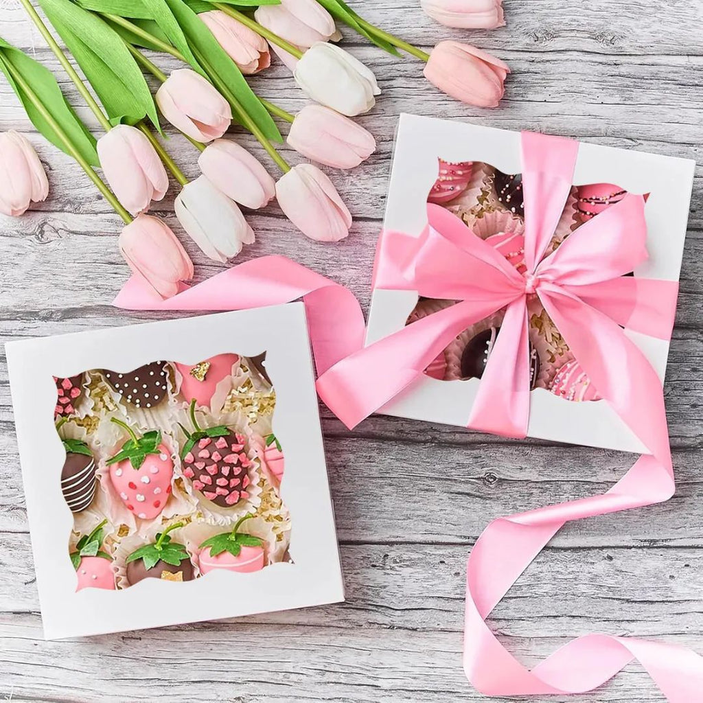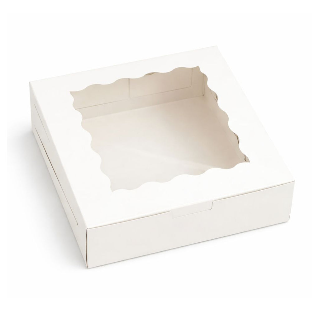 Caja blanca con ventana transparente, ideal para exhibir tus postres y creaciones reposteras con elegancia. Sus dimensiones de 20x20x6.5 cm la hacen perfecta para tartas individuales, cupcakes surtidos o pasteles medianos.