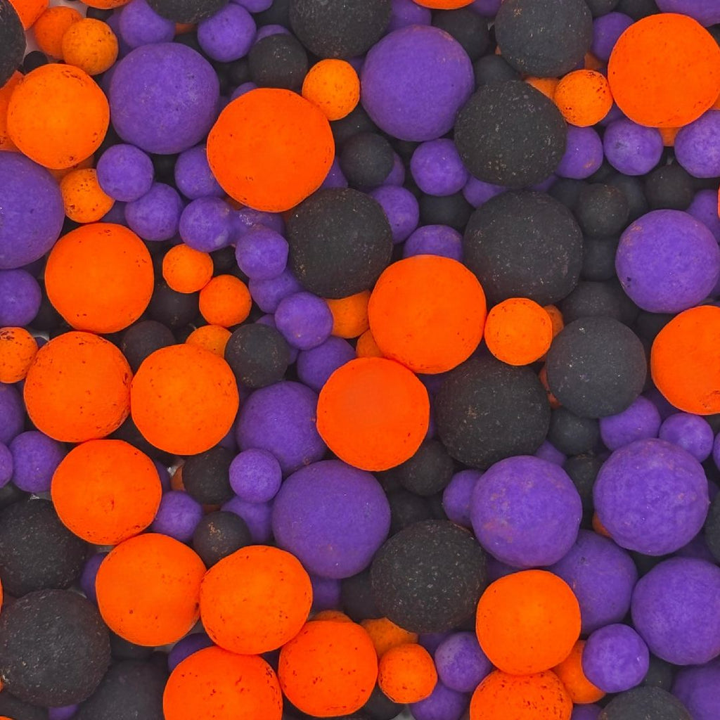 Grageas multitamaño color neón en tonos negro, naranja y morado.
